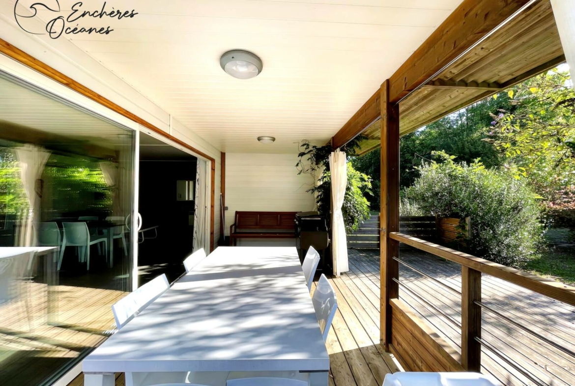 EXCLUSIVITE – Au sein d’un parc résidentiel de loisir, charmant chalet de 63m² env comprenant un séjour spacieux avec cuisine ouverte, une salle d’eau, des wc, deux chambres, et une suite parentale avec salle d’eau/wc. Belle terrasse couverte, idéal pour manger en famille! Cellier indépendant. Terrain privatif de 624m² piscinable. Copropriété de 37 lots, charges de 100€/mois environ incluant l’accès à la piscine, ping-pong, billard, Beach Volley, pétanque. Accès direct forêt. Vendu meublé et équipé. Bien rare dans un environnement boisé! Honoraires d’agence charge vendeur.
